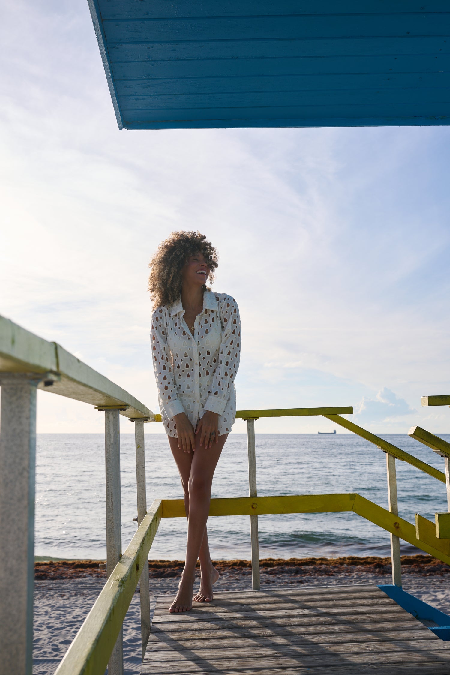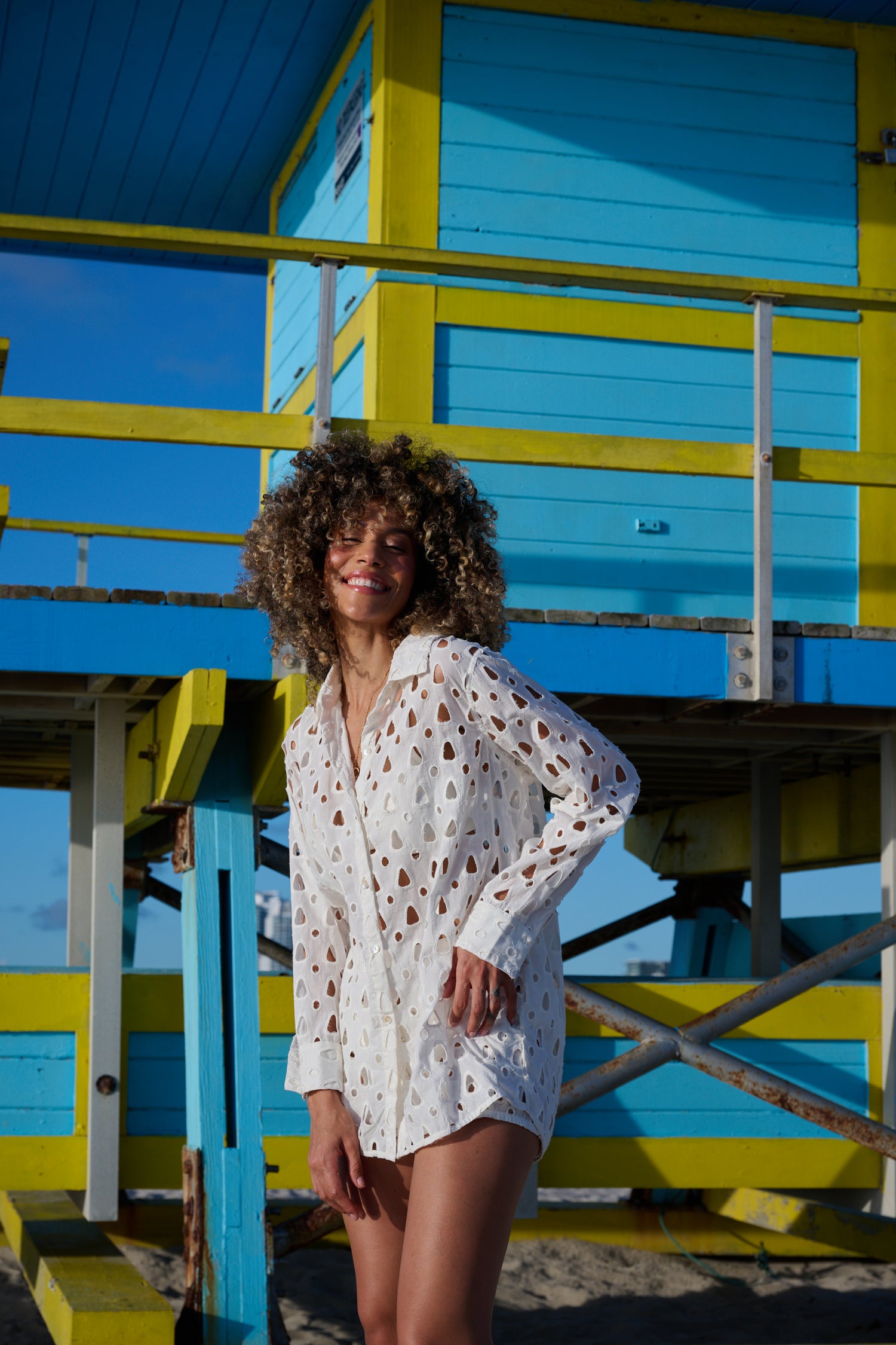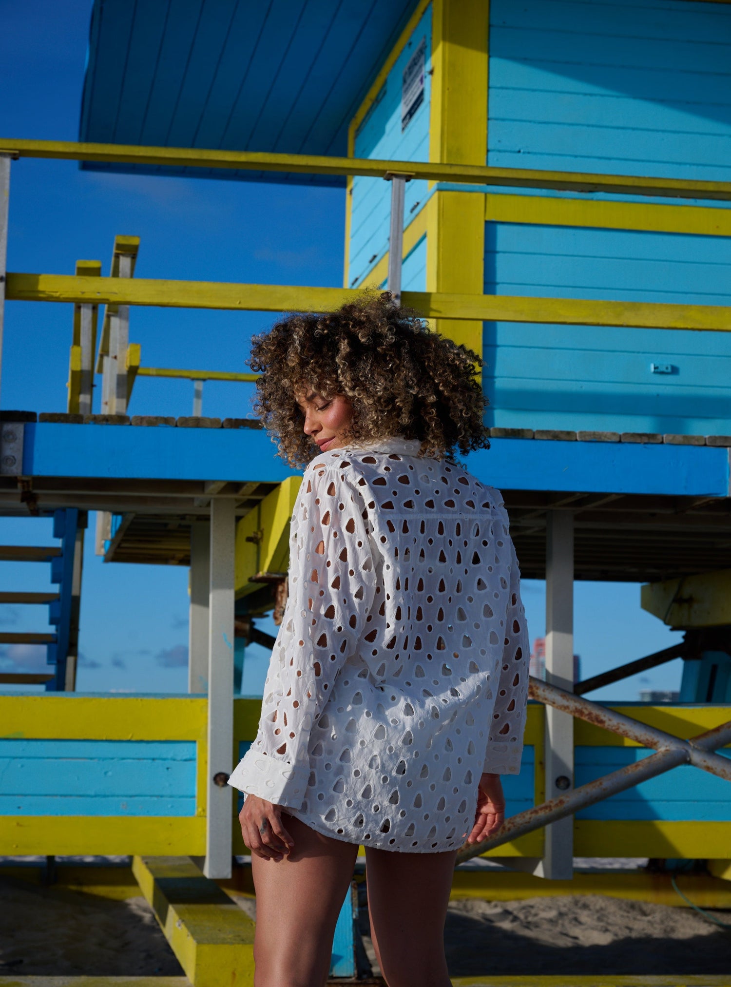 Breezy and effortlessly chic, this white eyelet button-down shirt features an all-over cut-out design, a classic collar , and a relaxed fit. Perfect as a beach cover-up or a lightweight summer layer, it adds a touch of casual elegance to any warm-weather look.