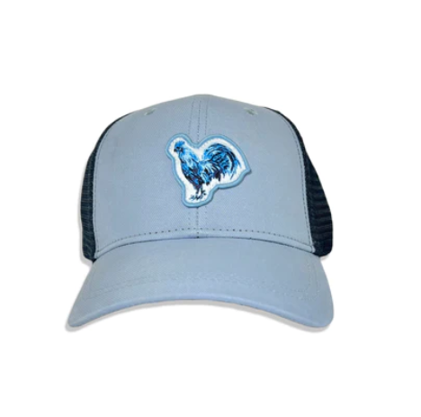 The perfect addition to your Southern Saint outfit! A chambray trucker hat with our custom painted Rooster patch on the front. Take home an iconic symbol of our islands! Navy blue mesh and adjustable back closure.