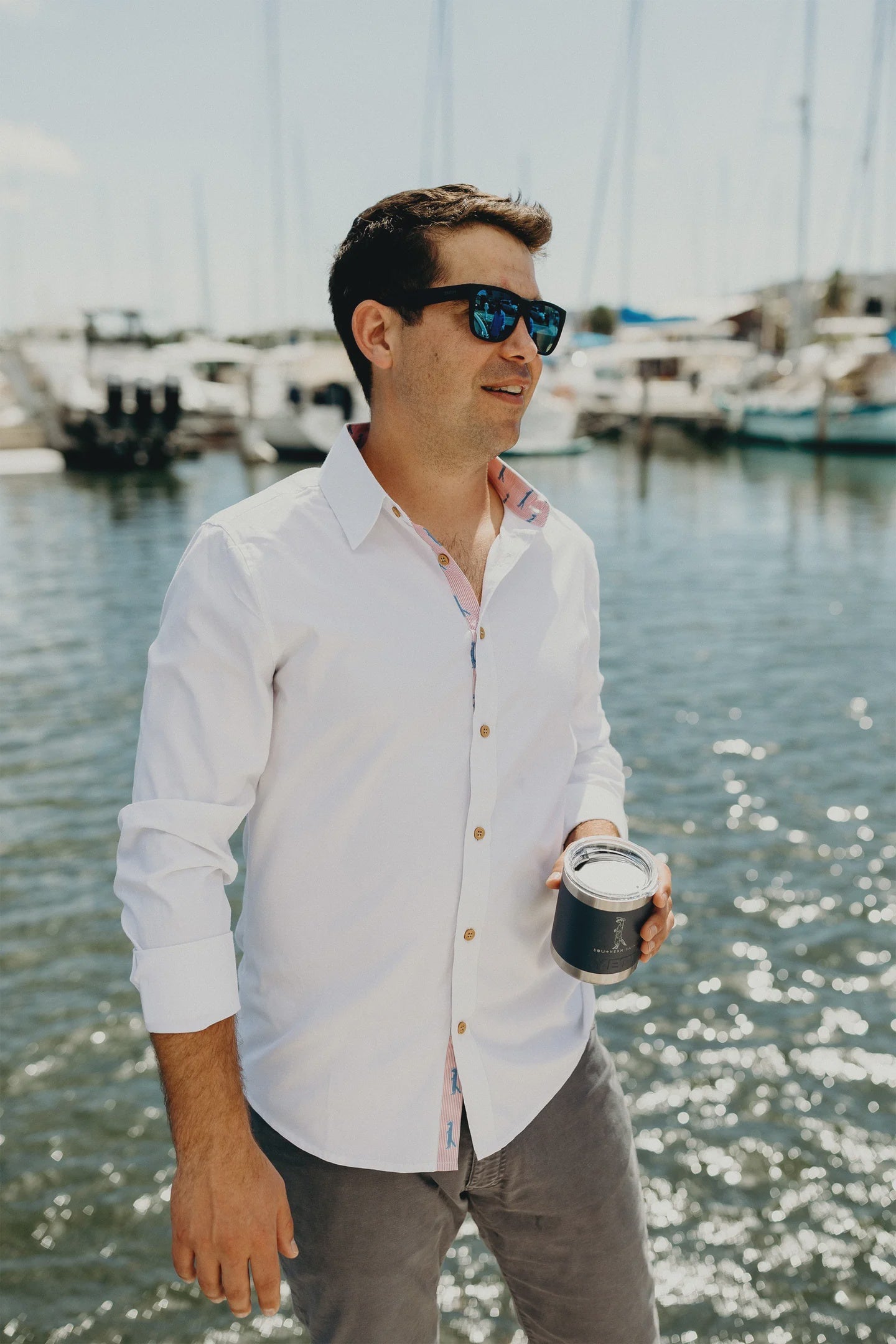 Step up your dinner attire and bring our beloved Saint Mongoose with you. Feeling frisky... flip up your cuffs! For a more conservative you, button them down. Our peach dress shirt comes with our Navy Constellation print on the cuffs and inside collar.