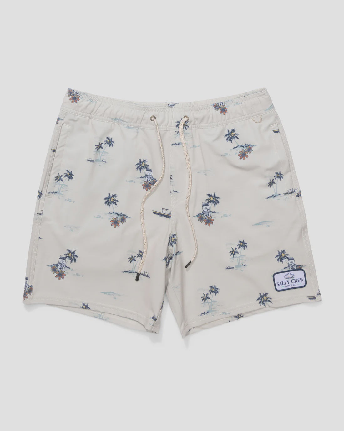 Ride the waves in style with these beige Salty Crew boardshorts, decked out in a playful tropical print of palm trees, boats, and island vibes. Perfect for beach days, boat rides, or just kicking back in the sun!