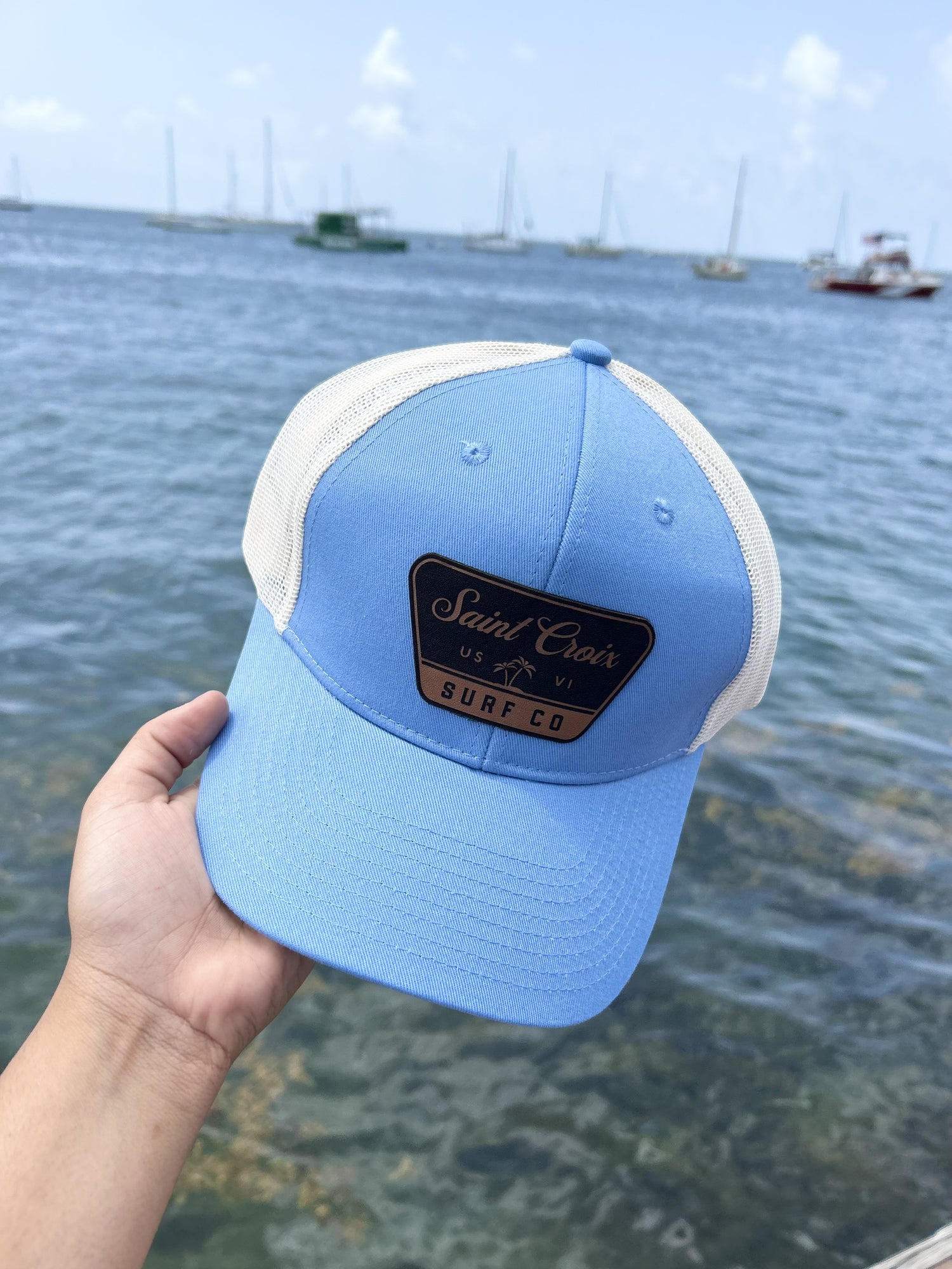 Stay cool and coastal in this sky blue and white/cream mesh trucker hat, finished with our signature Saint Croix Surf Co patch. A laid-back essential for island days and ocean views.