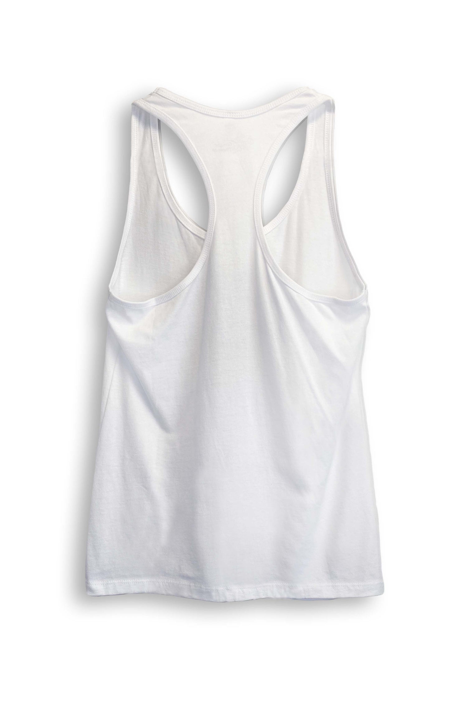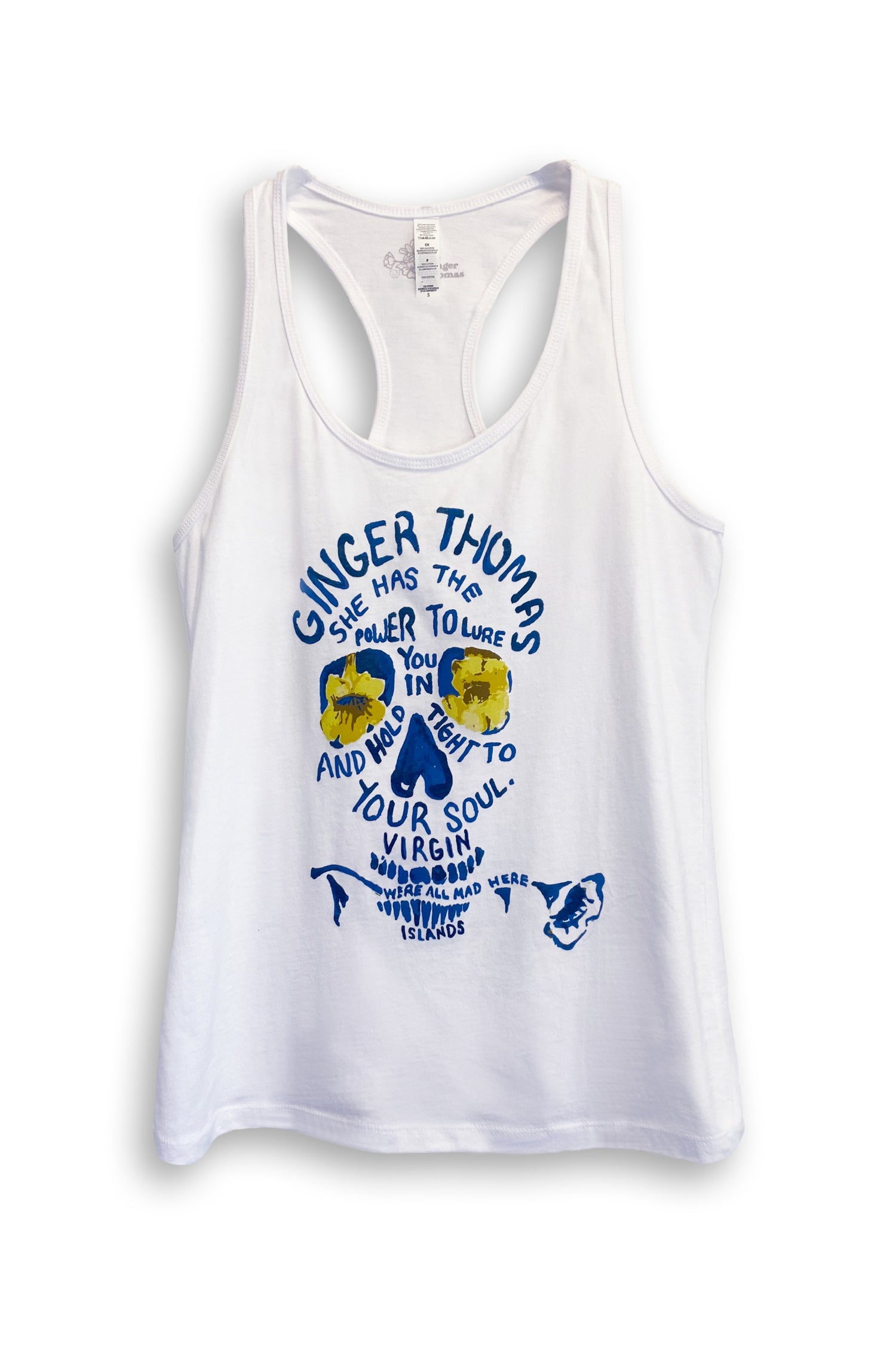 Racerback tank by Ginger Thomas with "We're all mad here" Graphic skull by Artist Briana Casale.