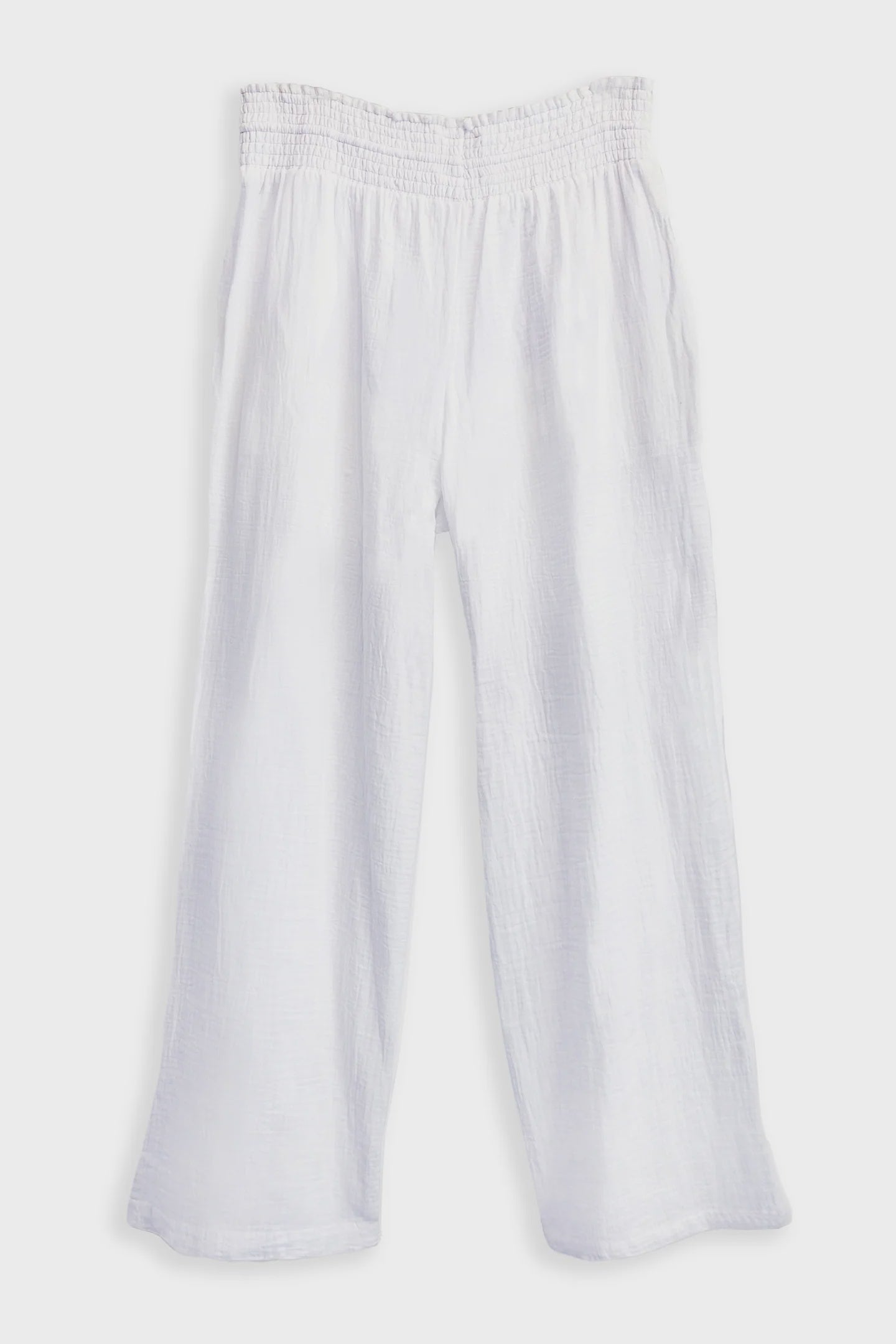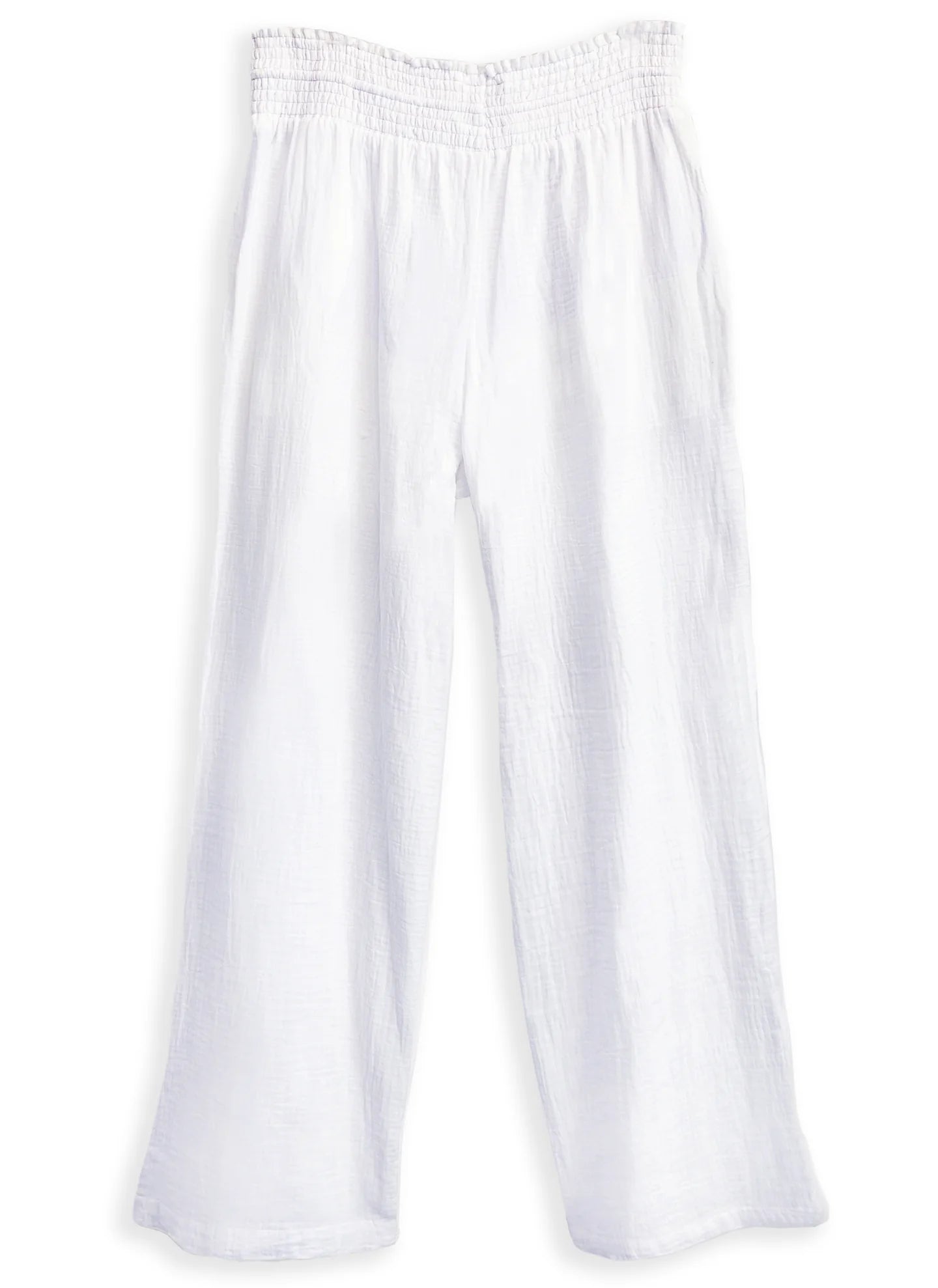 Crafted from ultra-soft double cotton gauze, these smocked drawstring pants are designed for all-day comfort and effortless style. The stretchy smocked waistband flatters every shape, while the lightweight fabric keeps you cool from morning errands to sunset strolls.